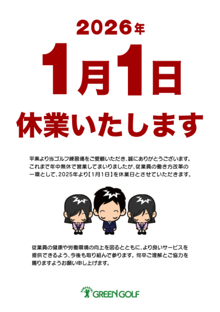 インフォメーション 2026年1月1日休業のお知らせ 平素より当ゴルフ練習場をご愛顧いただき、誠にありがとうございます。 これまで年中無休で営業してまいりましたが、従業員の働き方改革の一環として、2025年より【1月1日】を休業日とさせていただきます。 従業員の健康や労働環境の向上を図るとともに、より良いサービスを提供できるよう、今後も取り組んで参ります。 何卒ご理解とご協力を賜りますようお願い申し上げます。 前へ 一覧 次へ
