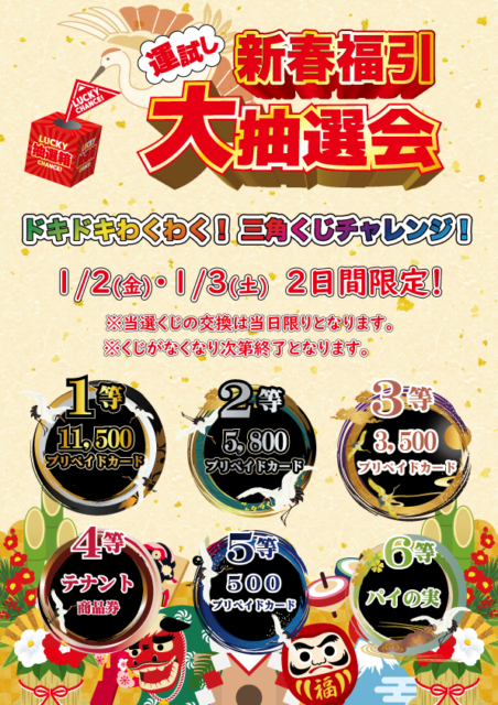 1月2日と1月3日は受付されたお客様は抽選箱から1回、三角くじを引くことができます♪