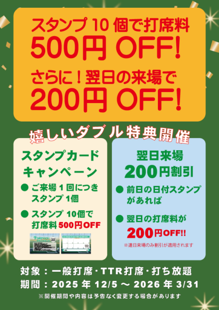 さらに、前日に来場されたお客様は翌日の打席料200円OFF もご利用いただけます。