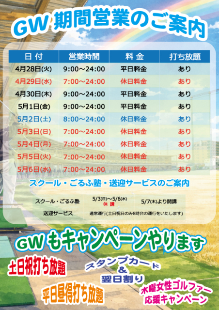 ※「スクール」および「ゴルフ塾」は、5/3(日)~5/6(水) の期間、休講 とさせていただきます。